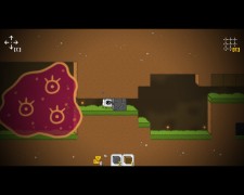 This game doesn’t have gameplay, it has gameplays… or gamesplay… Whatever the plural might be. The point is, the game is divided into two completely distinct but closely related modes. Most of the game is played in platform mode. This mode lets you run, jump, and drill. The key to the game is the collection of blocks. You’ll see cubes of wood, stone, sand, obsidian, iron, diamond, and other materials scattered through the environment, waiting for you to mine them, then craft them. (This may sound familiar, but I assure you, the not-so-coincidental resemblance between BTM and Minecraft is entirely superficial.) You’ll initially only be able to harvest blocks by jumping at them from beneath, and even then, only blocks made of wood, sand, or stone. Before long, though, you’ll earn yourself a drill, which not only allows you to start harvesting from the side, it gives you the ability to move much faster while it is running. As the game progresses, you’ll earn improvements that let you harvest metal and even diamond blocks.